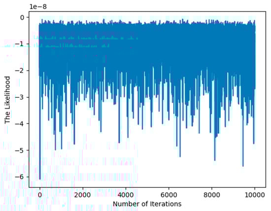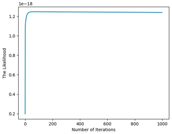 In the process of experimental set-up, the covariance of the posterior distribution defined by (50) may easily be a singular matrix, so we have to use a pseudo-inverse matrix to evaluate , which may produce the imprecise result that affects the increase in the likelihood function as shown in Figure 2.