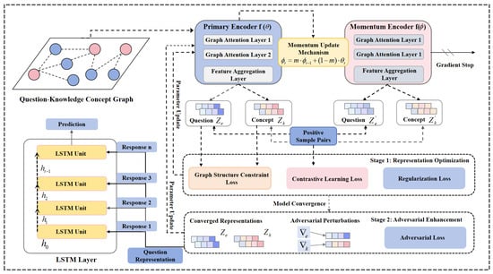 25], DECKT constructs a dual-branch architecture comprising a primary encoder using graph attention networks (GATs) for modeling question–concept interactions, and a momentum encoder updated through the exponential moving average (EMA) that maintains a stable representation space. The primary encoder actively learns from training data, while the momentum encoder provides consistent representations that serve as reliable contrastive targets. This design generates differentiated contrastive views without explicit data augmentation, preserving knowledge structure integrity while improving representation quality imbalance for low-frequency knowledge concepts. DECKT incorporates a momentum-based dual-encoder architecture that avoids destructive data augmentation while providing robust contrastive learning through the natural evolution of model parameters. Additionally, a graph structure constraint loss function maintains semantic consistency between questions and knowledge concepts in the embedding space, enforcing appropriate similarities between related concepts while ensuring sufficient separation between distinct concepts. Furthermore, an adversarial training mechanism enhances model robustness through min–max optimization, introducing carefully calibrated perturbations to input representations that improve generalization in sparse data environments. Together, these components create a comprehensive framework that addresses both representation learning challenges and structural modeling requirements for effective knowledge tracing.