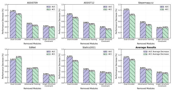 To evaluate the independent contributions of each DECKT component, we conduct systematic ablation experiments by removing the dual encoder architecture, adversarial training mechanism, and graph structure constraint loss. The results show clear hierarchical importance rankings across all five benchmark datasets, as shown in