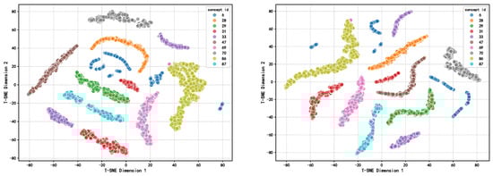Figure 3. The figure displays embedding distributions before (left) and after (right) applying contrastive and adversarial learning mechanisms, focusing on the 10 most sample-rich knowledge concepts (IDs 6, 28, 29, 31, 33, 47, 69, 70, 86, and 87) in the ASSIST09 dataset. The visualization results reveal that before training, question embeddings of the same knowledge concept (same color) demonstrate preliminary clustering tendencies, yet the overall distribution remains dispersed with irregular cluster shapes and ambiguous inter-class boundaries. Some knowledge concepts exhibit strong proximity relationships, such as ID 86 (yellow-green) with ID 6 (blue), and ID 69 (pink) with ID 31 (red) appearing significantly close in the embedding space; meanwhile, embeddings for ID 6 are particularly scattered, indicating poor representation quality and reflecting the model’s lack of distinct inter-class discriminative ability prior to training. After introducing contrastive learning and adversarial training, the structure of the embedding space improves markedly. The boundaries between different knowledge concepts become clearer, with more compact intra-cluster structures and significantly enlarged inter-cluster distances. For example, the previously mixed ID 86 and ID 6 achieve clear separation, while ID 69 and ID 31, though still adjacent, both demonstrate substantially enhanced internal cohesion. Additionally, previously dispersed knowledge concepts (such as ID 6 and ID 70) exhibit stronger intra-class cohesion. This indicates that through contrastive loss and perturbation mechanisms, the model significantly enhances intra-class similarity modeling and inter-class discriminability, improving the semantic structural consistency of embedding representations.