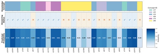 Figure 4 presents a heatmap visualization of DECKT’s prediction performance on a representative student interaction sequence, demonstrating strong predictive calibration across 27 questions spanning six knowledge concepts (c37, c45, c54, c69, c70, c86). The visualization shows excellent high-confidence prediction accuracy, with all predictions ≥ 0.7 probability (11 instances including 0.87, 0.81, 0.84, and 0.86) correctly corresponding to positive student responses. Conversely, low-confidence predictions ≤ 0.4 (seven instances such as 0.21, 0.23, and 0.34) predominantly align with incorrect responses at an 85.7% rate, with only one boundary case (0.34 probability with correct response in concept c69) deviating from expected patterns. The model achieves an overall prediction accuracy of 81.5% (22/27), validating DECKT’s effectiveness in capturing student knowledge states. However, the visualization also reveals concept-specific performance variations: while concepts c37 and c70 demonstrate perfect prediction–response alignment, concept c45 shows systematic prediction errors (0.66–0.67 probabilities with incorrect responses), and concept c86 exhibits challenging low-mastery patterns with predominantly low probabilities and poor performance outcomes. These variations highlight DECKT’s ability to differentiate between well-mastered and problematic knowledge areas, providing educators with nuanced insights into student learning patterns across diverse conceptual domains while maintaining robust predictive reliability in high-confidence scenarios.