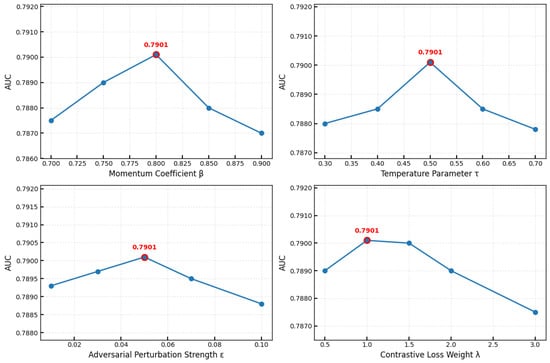 For the key components of the model, the momentum encoder’s update coefficient is set to 0.8, a relatively large value that ensures stability in feature representation. The temperature parameter for contrastive learning is set to 0.5, which has been validated as an effective value capable of producing sufficiently discriminative contrastive signals. In the adversarial training module, the perturbation upper bound is set to 0.01, with adversarial samples generated through 3 iterative steps, each with a learning rate of 0.001. These parameter settings have been thoroughly tuned on the validation set, achieving a good balance between model performance and training stability.