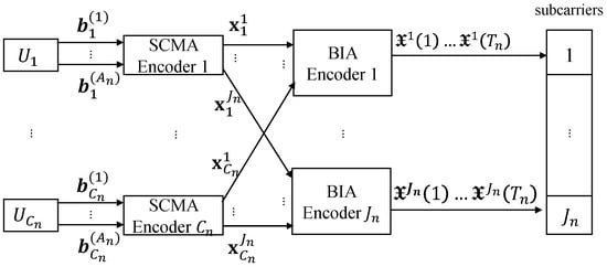 Figure 1 illustrates the transmitter design for the n-th cluster. We define as the k-th superuser, where , with representing the number of superusers in the n-th cluster. A superuser can either represent a single user, as assumed in [], or comprise a group of multiple users. The encoding process involves two steps: SCMA encoding and BIA encoding.