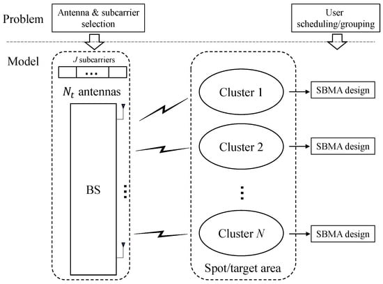 The problem can be described as follows: In a wireless network with N clusters covered by a BS, the BS must allocate antennas and subcarriers for each cluster. Additionally, by implementing SBMA, the BS needs to develop user scheduling and grouping strategies within the clusters. The objective of the BS is to serve as many users as possible. Given the absence of accurate CSIT, the BS allocates transmit power equally among clusters and users.
