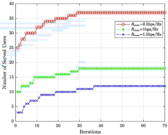 Figure 3 shows the number of served users achieved by the proposed algorithm through iterations when the SNR is 2 dB. The figure indicates that the performance curves almost converge after 30 iterations, which is efficient in practical terms. Furthermore, with improved minimum rate (), the number of served users decreases.