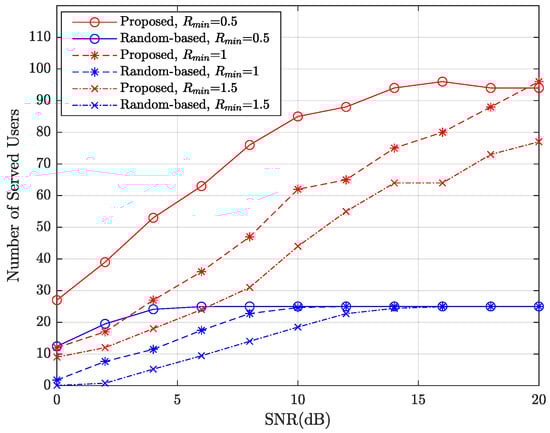 Figure 4 shows the performance of the proposed algorithm and the random-based algorithm as a function of the SNR. It is evident that as the SNR increases, the proposed algorithm consistently approaches the maximum number of served users (), while the random-based algorithm reaches a smaller number (approximately 25). Specifically, in high SNR regions (SNR > 28 dB), the proposed algorithm can support approximately 280% more users when . Furthermore, for smaller values, both algorithms exhibit better performance and faster convergence.