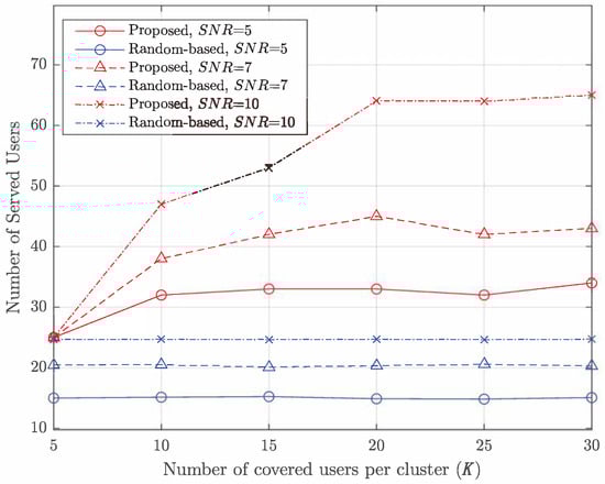 Figure 5 illustrates the performance as a function of the number of users per cluster (K). It shows that the proposed algorithm improves as K increases, while the performance of the random-based algorithm remains unaffected by K. Furthermore, the proposed algorithm serves approximately 113% more users than the random-based algorithm at an SNR of 5 dB, 115% more at an SNR of 7 dB, and 160% more at an SNR of 10 dB. At higher SNRs, the proposed algorithm achieves significantly better performance, particularly in scenarios where a large number of users are covered in each cluster.