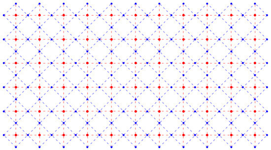 We consider dimers adsorbed on a simple square lattice of sites, indicated by the red points in Figure 1. The dual lattice is formed by connecting the midpoints of the links of the original lattice. The links are the lines joining each pair of neighboring sites (red, dashed). The dual lattice is the lattice of blue points located at the midpoints of the links of the original red lattice shown in Figure 2.