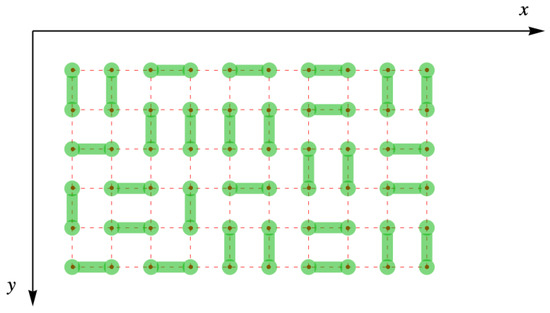 We now invent, following Fisher, a snake-like path through the lattice that allows us to use a one-dimensional numbering scheme to label the lattice sites. The numbering begins at the upper left corner and weaves back and forth along the x-direction, as shown in Figure 4. We note that this one-dimensional numbering scheme, serpentine numbering, also works for a three-dimensional lattice if one draws it on a long sheet of paper and then folds the paper with accordion-like pleats. For a lattice with rows of sites (red) arranged one below another in the vertical y-direction and columns parallel to one another in the horizontal x-direction, we have a lattice of sites. The virtue of this numbering is that it is easy to determine the signs resulting from the interchanges required to move identical s adjacent to one another. For the x-links it is obvious, because the two ends of a dimer are on adjacent sites, so no interchange is needed, and the sign is plus. For a y-link, consider the following example: the link between sites 27 and 40 in Figure 4. The y-links (vertical red dashed lines) look like the ties between two rails on a railroad track, and these ties have two ends. Thus, to move from position 27 to 39 (adjacent to 40) requires moving to the right by six interchanges () along row three, and then moving back left along row 4 by another six interchanges (). Because a tie has two ends, you will always obtain an even number of interchanges, and this will crucially make all terms positive in our construction of the partition function below.