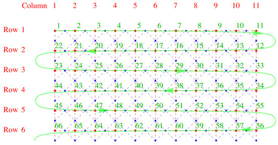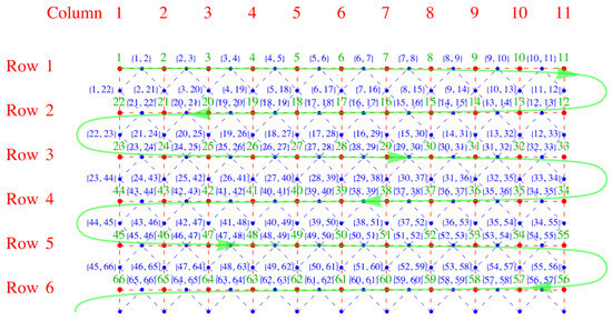 Serpentine numbering of the lattice sites in green. The row and column numbers of the lattice are also shown The red dots and dashes outline the direct lattice, and the blue dots and dashes the dual lattice.