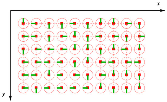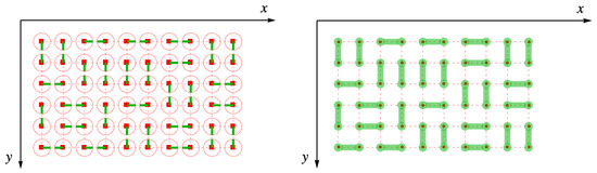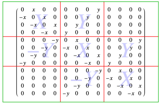 The link fields , , and refer to x-directed links, and the link fields , , , and refer to y-directed links. There are no near-neighbor links corresponding to the elements for which zero is entered. In other words, the entries sloping diagonally upward in the direction lower left corner to upper right corner are y-directed links. The remaining ones sloping downward from the upper left to lower right corners are x-directed links in the pattern shown in the matrix M in Equation (30).