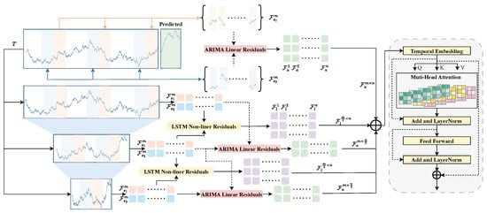 where is the matrix of residual values from time to t, and is the predicted residual sequence for the next steps. In other words, learns to predict the future errors of the linear ARIMA model, using the pattern of recent errors as input. This deep module is flexible and can capture complex patterns such as nonlinear dynamics, seasonal fluctuations, or any regime changes that the ARIMA model’s linear structure cannot fit. For example, could be an LSTM that ingests the sequence and outputs , or a Transformer that attends to the residual sequence to forecast upcoming residuals. The parameters of this network are learned from data. Typically, w is chosen to be large enough to provide the deep model with sufficient context but not so large as to be unwieldy; for instance, w might be 36 for weekly data or 96 for hourly data, as detailed in the Experiment section.