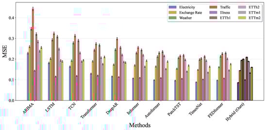 To demonstrate the statistical reliability and comprehensive superiority of our proposed hybrid model, we present detailed performance comparisons across multiple evaluation metrics and all nine benchmark datasets. Figure 11 illustrates the Mean Squared Error (MSE) performance across all baseline methods and nine datasets (Electricity, Exchange Rate, Weather, Traffic, Illness, ETTh1, ETTh2, ETTm1, and ETTm2). The results clearly show that our hybrid approach consistently achieves the lowest MSE values across all datasets, with particularly significant improvements on the Traffic and Weather datasets, where the error reduction exceeds 15% compared to the best baseline methods. The error bars, representing standard deviations over five independent runs with different random seeds, demonstrate the stability of our approach with notably smaller variance compared to pure deep learning methods.