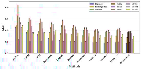 MAE performance comparison across all baseline methods and nine benchmark datasets. Each method shows results for the Electricity, Exchange Rate, Weather, Traffic, Illness, ETTh1, ETTh2, ETTm1, and ETTm2 datasets with error bars indicating standard deviation over five runs. The hybrid model outperforms all baseline methods in terms of MAE, confirming its robustness across diverse time series characteristics.