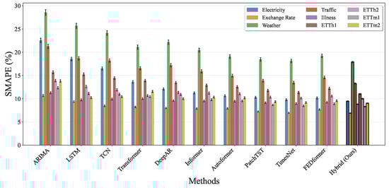 SMAPE performance comparison across all baseline methods and nine benchmark datasets. Each method shows results for the Electricity, Exchange Rate, Weather, Traffic, Illness, ETTh1, ETTh2, ETTm1, and ETTm2 datasets with error bars indicating standard deviation over five runs. The hybrid approach achieves the lowest SMAPE values across all datasets, indicating superior relative forecasting accuracy independent of scale.