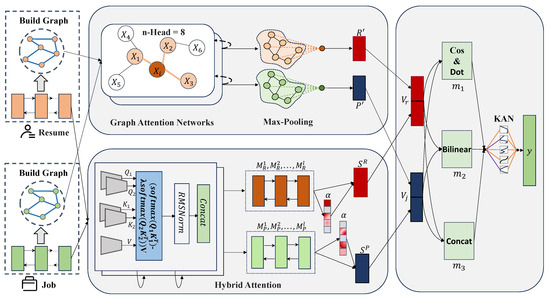 First, the resume representation of job seekers obtained through hybrid attention mechanism encoding is concatenated with the resume features extracted by the GATs to obtain the fused resume representation . The semantics representation of job requirements is similar to that of job seekers’ resumes. The calculation formulas for the resume representation and job requirements are as follows: