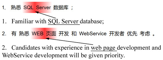 The attention mechanism can intuitively display the importance of different words in job posting requirements, as shown in Figure 2. In Sentence 1, some words are highlighted as key phrases, such as “SQL Server”. The highlighted key phrases are shown in dark red, indicating that the attention weight of this key phrase is higher. This experimental results indicate that the proposed FSEGNN-PJF framework paid a great deal of attention to job skills. In Sentence 2, the skill of “WEB page” is highlighted as a key phrase. In contrast, some more general or common words, such as “WebService development”, are not focused on. Analysis of the experimental results shows that the proposed FSEGNN-PJF framework in this paper performs well in capturing key skills.