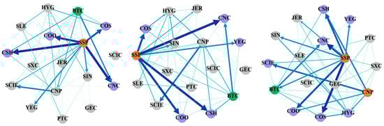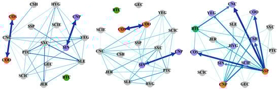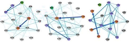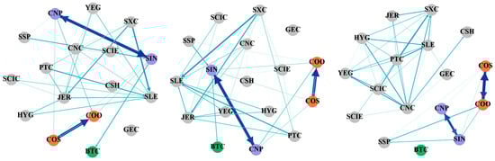 Figure 3 displays the network in an extreme decline state based on the frequency domain viewpoint. Compared with the conditional median state, the edge strength in the three periods has deepened, and the clustering is more obvious, which is consistent with the results of time domain analysis. As a risk bearer, Bitcoin’s risk tolerance intensity has increased compared with the normal state. In the short and medium term, the risk spillover effect between CNP and SIN and COS and COO is obvious. In the long term, multiple nodes show significant spillover effects. The connection between regional listed energy companies such as YEG, SXC, HYG, PTC, SLE, CNC, and SCIC is closer. Therefore, under the extreme decline of risk, regulators should pay attention to the changes in the intensity of tail risk spillover under different economic cycles and focus on the risk contagion between regional companies.
