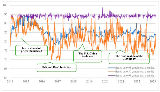 Taking the largest change in the total spillover effect under the normal condition as an example, global crude oil prices began to fall sharply in the second half of 2014. China is one of the world’s biggest net oil importers, so the volatility of global crude oil prices directly affects China’s energy import costs and energy prices. In the first half of 2015, China’s stock market experienced a wave of continuous rise, but then it began to fluctuate violently in June. On 24 August 2015, China’s stock market ushered in a crash known as “Black Monday”. This crash further exacerbated the market’s anxiety and had a negative impact on the entire economy and various industries, including the energy sector. Therefore, the total spillover level of tail risk was at a high level from 2014 to mid-2016. Since then, the Chinese government has increased its efforts to eliminate industries with excess capacity, especially the steel and coal industries, reducing excess capacity and optimizing the energy supply and demand structure. It has increased its support for clean energy, including the development and utilization of new energy, reducing dependence on traditional energy and diminishing environmental pollution and energy security risks. In addition, China has actively promoted the “Belt and Road” initiative and strengthened energy cooperation and exchanges with neighboring and international markets. Through diversified energy supply channels, the risks brought by individual supply sources are reduced, so the total risk spillover level in this stage has declined significantly.