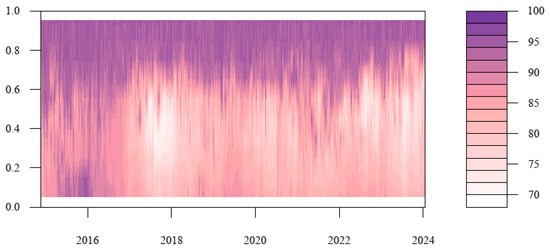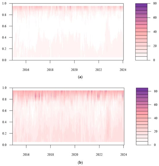 Figure A1 shows the dynamic variations in the net spillover of tail risk of Bitcoin and energy companies based on various quantiles. Among these, purple indicates a negative net spillover impact from tail risk, green indicates a positive net spillover effect from tail risk, and purple to green indicates a transition from a negative to a positive net spillover effect.