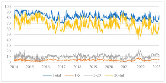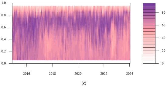 Based on the conditional median, we analyzed the total risk spillover from a frequency domain perspective under normal conditions. To further examine the spillover impact in various risk states, Figure 8a–c extend it to the dynamic variation of total risk spillover in each time horizon under various quantiles. As can be seen from the figure, the total tail risk spillover effect between cryptocurrency and China’s energy market increases significantly as the horizon grows. Primarily, in the short term, the tail risk spillover index is generally at a low level. In the medium term, risk spillovers are enhanced at high quantiles, while the long-term spillover effects are significantly enhanced at all quantiles. Hence, when extreme events occur in the market, investors should pay attention to the cross-contagion of tail risks brought about by long-term high volatility in cryptocurrency and energy markets. Additionally, the asymmetry of the tail increases with time, and the right tail spillover level was seen to be substantially greater than the left tail. This demonstrates that the total risk spillover effect is more obvious under the state of extreme risk increase. At this time, the risk linkage between Bitcoin and listed energy companies is stronger, and the extreme event shock is more likely to cause risk contagion. Consequently, regulatory authorities should formulate corresponding regulatory measures based on the heterogeneity of the total connectedness index under different risk states.