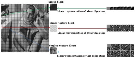 The similarity between a dictionary atom and an image block is a crucial factor in determining atom matching. The higher the similarity between the dictionary atom and the image block, the more likely the atom is to be selected. For smooth image blocks, their similarity is higher with broad-ridge atoms. Therefore, wide ridge atoms are more likely to be selected to match smooth blocks. Further analysis showed that for a smooth image block, since the energy of the high-frequency components is very small, the linear combination of wide ridge atoms can limit the error energy to a very small range, while for a texture block, to limit to a small range, more atoms with narrower ridges are needed. An example is shown in Figure 1.
