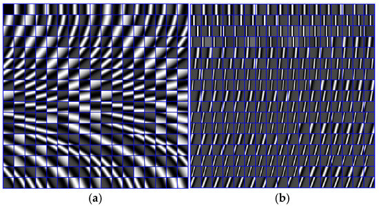 Since the approximate representation of a smooth block requires only atoms with wide ridges, the ridgelet dictionary can be decomposed into a smooth dictionary and a texture dictionary according to the ridges’ scale. The smooth dictionary is noted as , which consists of 319 broad ridge atoms whose scale parameter ,