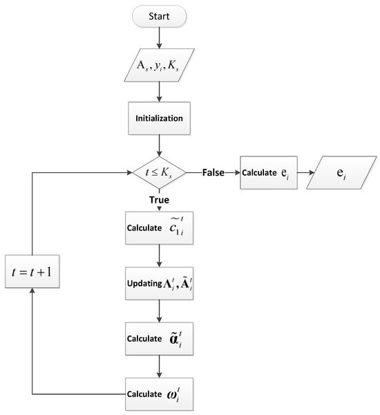 First, the residual is initialized as , the selected atomic index is initialized as , and the selected atomic set is initialized as . In each iteration, the algorithm matches and selects an atom from that is the most similar to the current residual. That is, in the -th iteration, it finds the index corresponding to