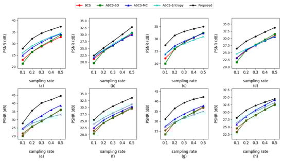 In this section, the proposed method is compared with the ABCS-SD [] ABCS-MC [], ABCS-Entropy [], and BCS [] methods. Among them, the ABCS-SD, ABCS-MC, and ABCS-Entropy methods are adaptive sampling rate methods, and the BCS is a traditional fixed-rate method. The ABCS-SD and BCS methods were not optimized for the reconstruction method and were reconstructed using the SPGL1 algorithm, consistent with the proposed method. For the other methods with optimized reconstruction processes, their optimized processes were used in the experiments.