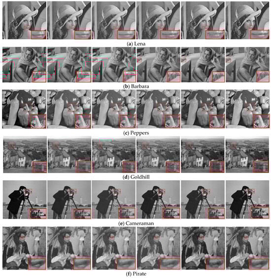 The PSNRs (peak signal-to-noise ratios) of the reconstructed high-resolution images for different sampling rates are shown in Table 4. The reconstruction quality plots are illustrated in Figure 4. As shown in Table 4 and Figure 4, the method proposed in this article achieved the best PSNRs for all test images. We considered that this was mainly due to the proposed method being able to accurately identify smooth and texture blocks as well as the better sparse representation ability of the overcomplete dictionary. We also would like to mention that Figure 4 shows that when the sampling rate increases from the lowest values, such as increasing from 0.1 to 0.2 or 0.3, the reconstruction quality of the proposed method improves faster than that of the other methods. When the sampling rate is sufficient, such as increasing from 0.4 to 0.5, the quality improvement provided by the proposed method slows. It can be considered that when the sampling rate is insufficient, the proposed method quickly allocates the increased sampling resources to the complex blocks that need these resources. It also shows that this method relatively accurately identifies texture blocks.