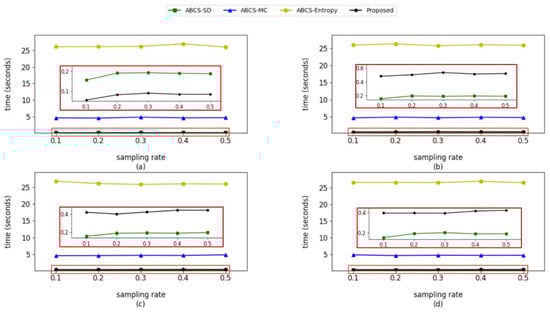It can be seen from Figure 6 that, when the test image is simple, our method outperforms all other methods in speed, and when the test image is more complex, the proposed method is slightly slower than the ABCS-SD method, but the gap is not large. The experimental results show that the proposed method is a low-computation-complexity method.