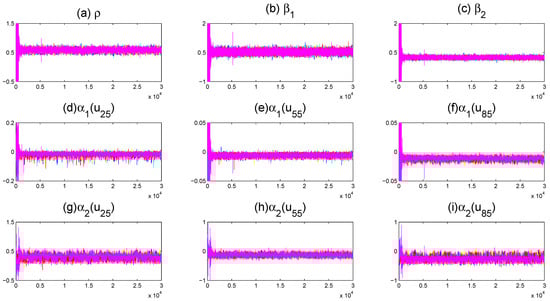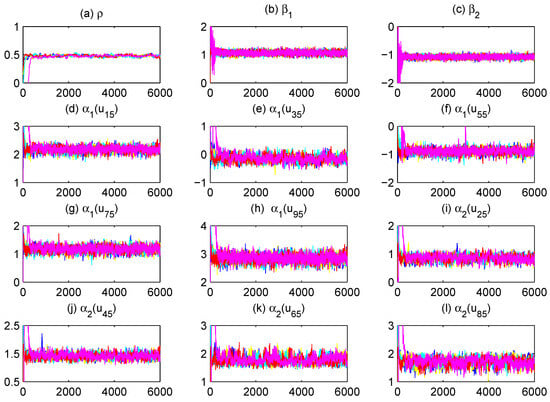 where , and is the Euclidean norm. Based on the above designs, we conducted 1000 replications of each experiment. We executed five independent runs of the proposed Gibbs sampler with different initial states and generated 10,000 sampled values after a burn-in of 20,000 iterations in each experiment. Part traces of parameters are plotted in Figure 5 (only a replication at the median quantile () is displayed), showing satisfactory mixing across parallel sequences. Using the five parallel sequences, we computed the “potential scale reduction factor” , which is plotted in Figure 6 (the case of quantile). These diagnostics confirm Markov chain convergence within the 20,000-iteration burn-in period.