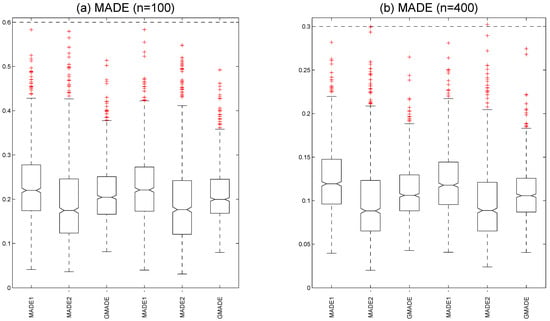 Mean absolute deviation errors are presented in boxplots: (a) for and (b) for (the three left panels are based on a Rook weight matrix and the three right panels are based on a Case weight matrix with ).
