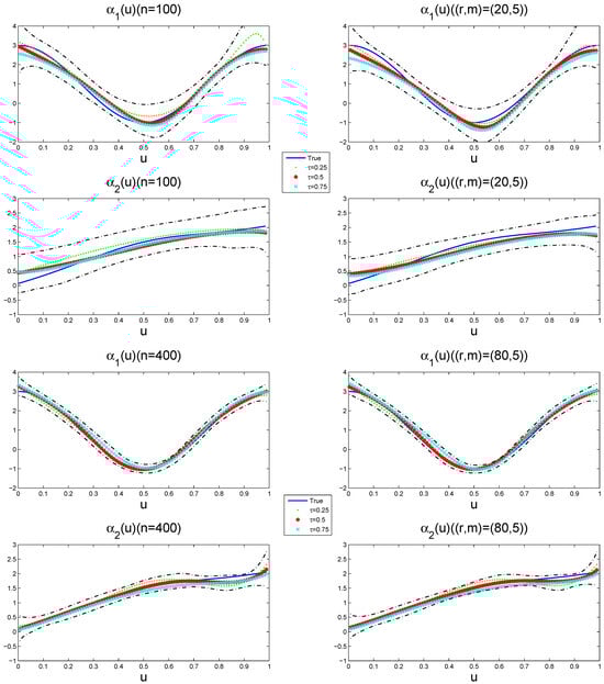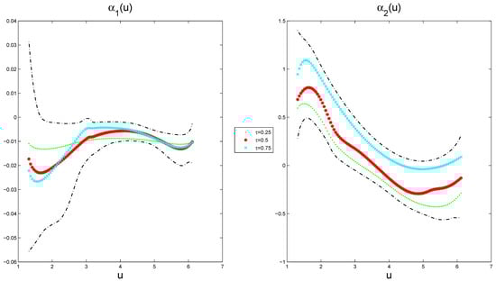 Figure 4 depicts the estimated varying-coefficient functions at different quantile points, together with its 95% pointwise posterior credible intervals from a typical sample under when the sample size is and , respectively. The way to select a typical sample is to make its GMADE value equal to the median of the 1000 replicates. The results show that the estimation performance of the variable coefficient function improves with the increase in the sample size, while the effects exhibit quantile-specific heterogeneity across the response distribution.