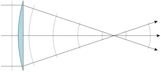 The curved surface of a thin plano-convex lens maps an incident plane wavefront into a spherical wavefront. By placing a point source on the focal point and flipping the curved surface towards it, the curved surface now maps the incident spherical wavefront into a plane wavefront. Source: https://commons.wikimedia.org/wiki/File:Spherical_wave_lens2.svg (accessed on 24 June 2025)—CC BY-SA 3.0.