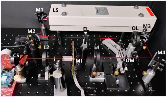 Optical system assembled for our experiment. The red-line segments indicate the path of the light throughout the system, which was produced by a -nm helium–neon laser source (LS) and whose height and slope of the laser beam was precisely controlled by a set of four aluminum mirrors (M1, M2, M3, and M4). Between M2 and M3, a Keplerian telescope was set up, using an eyepiece lens (EL) of mm and an objective lens (OL) of mm, producing a collimated beam of approximately 1 cm in diameter at the back of OL. That collimated beam was guided by M3 and M4 to a system using two biconvex lenses (L1 and L2) of mm. At the object plane, the object mask (OM) shown in Figure 3 was positioned, imprinting a letter “A” on the beam as a shadow. At the Fourier plane (where L1 and L2’s foci coincide), a remotely operable motorized iris (MI) was placed for aperture control. At the image plane, a camera sensor (CS) was settled: a lensless 5-megapixel camera module connected to a Raspberry board (partly visible at the lower left corner).