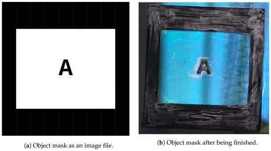 A letter “A” absorptive mask used as the object mask (OM) in the optical system of Figure 2. The design shown in (a) was initially printed on a glossy paper sheet using a high-quality printer. Then, the printed layout was cut from the sheet and placed over a piece of anti-reflective coated glass, secured by tape at the edges. Next, the paper–glass assembly was subjected to a heated press, commonly used for small-scale printed-circuit-board fabrication, to transfer the printed layout to the glass surface. However, due to the poor quality of the glossy paper, a thin layer of that material remained on the glass. That residue was manually removed using fingertip friction, which damaged parts of the print in the process. Around the letter “A”, a small file was used to avoid damaging the character itself, which in turn left scratches on the surrounding surface. Finally, a black marker pen was used to fill in the damaged areas on the print. The object mask is seen in (b) reflecting the blue spectrum of the ceiling light, highlighting artifacts introduced during the making process, which will influence the results in Section 5.