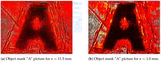 The sequence of images in Figure 5 displays how the features defining the letter “A” become more distinguishable as the aperture is reduced, making them darker. Moreover, imperfections in the object mask also become more evident at smaller apertures, artifacts that will be considered later in our analysis. Those images will be revised when we analyze the behavior of the entropy, whose calculation is described in Section 5.2.