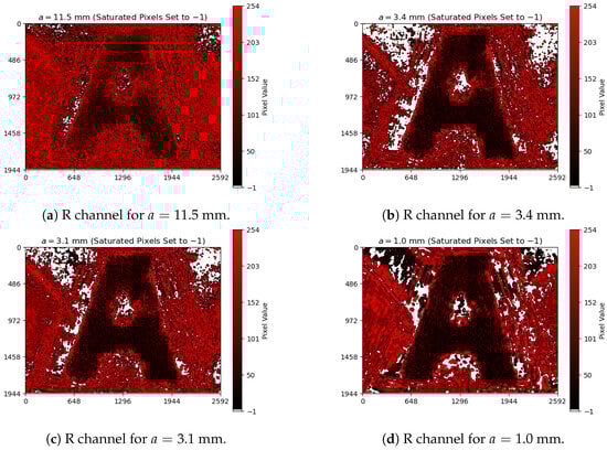 Each image file is represented as a tensor, corresponding to the three color channels (RGB) and the pixel arrays captured by the camera sensor for each color. As the laser wavelength was nm, we used only R-channel data, converting the images into pixel matrices, whose values range between 0 and 255. We computed the definitive image as the mean (-matrix) with its standard deviation (-matrix) of the 10 acquired images, resulting in two characteristic matrices for each aperture. For saturated and high-variance () pixels in the -matrix, their values were assigned to , excluding them from the calculations in Section 5.2. To distinguish between viable and unviable pixels in the -matrices (i.e., the definitive images), we created a custom colormap, setting as white, 0 as black, and 254 as red, as shown in Figure 5. The full list of 36 final images (means plus their standard deviations) is presented in Appendix A.