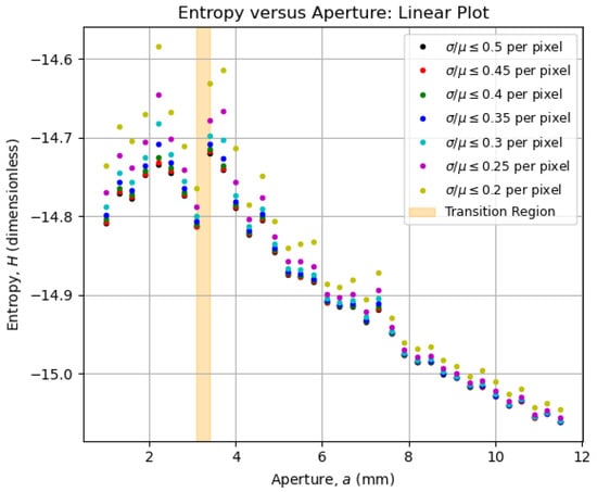 For apertures bigger than an expected optimal value, the entropy increase can be approximated to a straight line on a logarithmic scale, as seen in Figure 7. That growth behavior is a characteristic feature of the assembly constituted by the imaging system and the imaged object, and it can be used as a reference for determining the transition region for quasi-static scenarios (e.g., slow chemical reactions on a slide as the imaged object). In terms of content, the smaller the aperture, the greater the information about the object, as observed in Figure 5a,b, with the details of the letter “A” becoming sharper. That information, however, is ultimately limited at the transition region, given an imaged object.