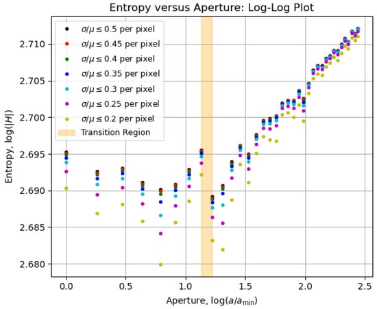 To investigate the statistical quality of the collected data, we filtered the pixel values from the - and -matrices between the procedures from Section 5.1 and Section 5.2 to retain only those satisfying selected thresholds for the coefficient of variation, , such that the ratio was less than or equal to the specified values. This allows us to observe how robust the overall behavior of entropy as a function of aperture remains as the coefficient-of-variation threshold for pixels is progressively reduced. Therefore, the diagrams for selected curves are shown on a linear scale in Figure 6 and on a log–log scale in Figure 7.