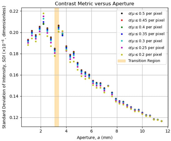 Contrast metric defined in Equation (9) as a function of the aperture for fixed coefficient-of-variation thresholds. Notice how the contrast metric increases as the aperture decreases, changing its behavior at the transition region. For lower apertures, the contrast metric does not vary significantly.