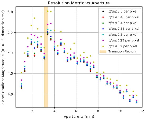 Again, ∗ denotes the convolution operator, and are the w-direction Sobel kernels; their convolution with the elements of the -matrices allows us to determine the gradients in the x- and y-directions. To handle the discontinuities seen in Figure 5 due to the saturated pixels, we set their values to zero within their normalized -matrices. With that, we computed the resolution metric and plotted it as a function of the aperture in Figure 9.