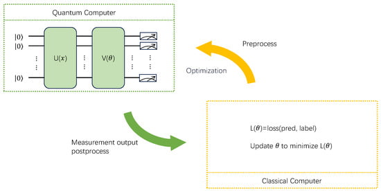 The PQC denotes a quantum computing model that uses adjustable parameters to construct quantum states, which can be optimized during the learning process. The PQC often needs to collaborate with classical networks or optimizers running on a computer to adjust a model’s parameters and train the model. The parameters optimization process of the PQC employs classical algorithms to evaluate a model’s performance and guide the model parameters’ update process. Therefore, in practical applications, the PQC is typically used as part of a quantum-classical hybrid algorithm. The application of the PQC enables quantum hardware to perform quantum state preparation and evolution while using regular computers for data processing and optimization, thus allowing the execution of quantum machine learning tasks. The process where a quantum computer and a classical computer collaborate to complete a learning task is illustrated in Figure 1.