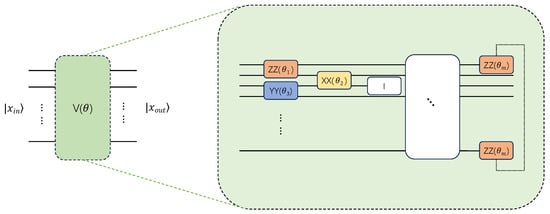 The most important part of the QNN model, the variational layer, is displayed in Figure 3. In this layer, the placement and types of all quantum logic gates are determined by the AQEA, which is explained in detail in Section 3.2. However, it should be noted that the parameter gates in this layer differ from those in the encoding layer. Namely, in the encoding layer, the parameters are usually fixed and stay fixed after being defined unless the input data changes. By contrast, the parameters of the variational layer are updated, typically using the gradient descent method or other optimization algorithms, with the aim of minimizing the loss function value. During training, the parameters are gradually optimized based on feedback until the algorithm convergences to an ideal state.