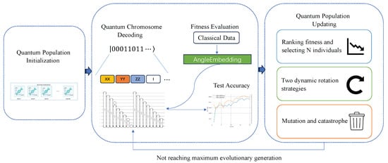 The proposed AQEA can be roughly divided into several parts as follows. First, the quantum population initialization is performed, and related parameters that affect the population change, such as the population size, gene length, maximum number of evolutions, the coefficient related to the rotation angle, and the catastrophe factor, are set. Next, the observation of the initialized quantum population is conducted, which simulates the measurement operation in a quantum network. The purpose of this process is to obtain a definite quantum population state, which defines the search space of a quantum logic gate. Next, quantum circuits are created in sequence based on the obtained quantum population. In this study, the term quantum circuit refers to the above-mentioned variational layer, and the arrangement order of quantum gates in the encoding layer is prepared in advance and does not change during the algorithm updating process. The fourth step is the evaluation of the population fitness value, where the fitness selection is based on the accuracy rate of the quantum circuits created by the population individuals on the test dataset. The quality of the population of individuals is judged based on the accuracy rate. The last and most important step is the quantum population update. In this study, an adaptive mechanism is proposed to update the quantum population, and two dynamic rotation angle update strategies, as well as a mutation strategy, are designed using the number of evolutions and the fitness value of the individuals to update the quantum population. Meanwhile, during the evolution process, to prevent the population from developing in a poor direction, the parent generation and the evaluated offspring generation are combined at each iteration to select the next generation. In addition, a catastrophe factor is introduced to monitor whether the population has fallen into a local optimum and to activate the quantum catastrophe strategy to break the current state when needed, thus continuing to search for the optimal architecture. The flowchart of the proposed algorithm is presented in Figure 4.