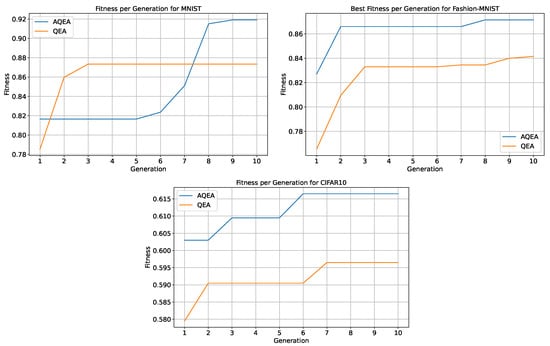 In AQEA, the fine-tuning process of parameters is critical as these parameters directly govern the algorithm’s exploration efficiency, generalization capability, and overall performance. To identify the optimal configuration and validate its effectiveness, this study conducted extensive experiments to systematically evaluate the impact of different parameter combinations. By meticulously adjusting the population size N, generation count T, and rotation angle parameters and , this paper identified that the configuration , achieves a balance between computational efficiency and maximized expressive power across diverse datasets. Experimental results from Table 6 demonstrate that this parameter configuration not only improves the model’s fitness value (i.e., optimization objective performance) but also ensures algorithmic stability and robustness across heterogeneous problem scenarios on benchmark datasets including MNIST, Fashion-MNIST, and CIFAR-10. Notably, the smaller N significantly reduces per-iteration time costs, while the appropriate T guarantees sufficient exploration of the solution space. Furthermore, the carefully selected rotation angle parameters enhance the algorithm’s ability to escape local optima, facilitating the discovery of global optimal solutions.