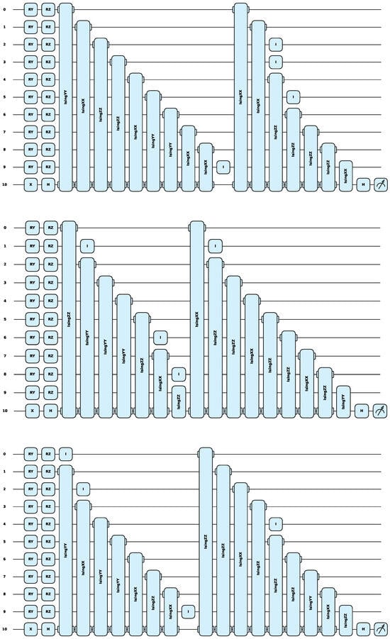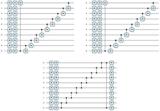 In the first encoding module, the preprocessed data are encoded into a quantum state using . In Figure 2, on the left side of is the input quantum state. In this study, 10 qubits are used, with the initial state of all 10 qubits set to the state by default; contains two layers of rotation gates, a layer of gates, and a layer of gates. It should be noted that using two layers of rotation gates can enhance the expressive power of a quantum circuit. Namely, through multiple rotations, the quantum state can be adjusted more precisely, allowing for better capturing of the complex structure of data. After the mapping process, the input vector is converted into rotation angles to guide the rotation process of the qubits, which are then sent to the second module parameter quantum circuit of the QNN.