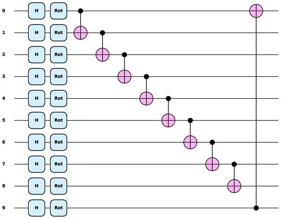 In these experiments, parametric quantum circuits in the VQDNN proposed in [55] were first used. The PQC employed in the VQDNN is displayed in Figure 7, where it can be seen that it includes the Hadamard gate, Rot gate, and CNOT gate. Only the Rot gate had three parameters for a total of 10 qubits, which corresponded to 30 training parameters. This structure was then used for training and testing on the three datasets, namely, the MNIST, Fashion-MNIST, and CIFAR-10 datasets.