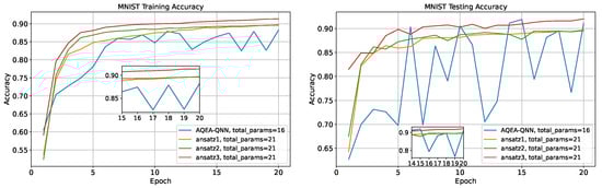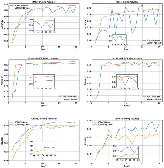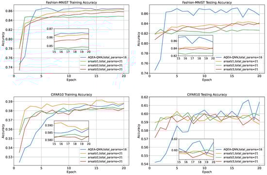 The training and testing curves of the two models are depicted in Figure 8, where it can be observed that on the MNIST and CIFAR-10 datasets, the accuracy of the AQEA-QNN on the test dataset was higher than that of the VQDNN-PQC by 3.4% and 2.9%, respectively. In addition, the VQDNN-PQC had 3×10 + 11 = 41 parameters, where the 11 parameters denoted the 10 weights and one bias of the subsequent fully connected network. However, the AQEA-QNN had 16 parameters, which denoted less than half of the VQDNN-PQC’s parameter number. However, on the Fashion-MNIST dataset, the number of parameters of VQDNN-PQC is 25 more than that of AQEA-QNN, but its accuracy is only 0.05% higher. The results are presented in Table 4.